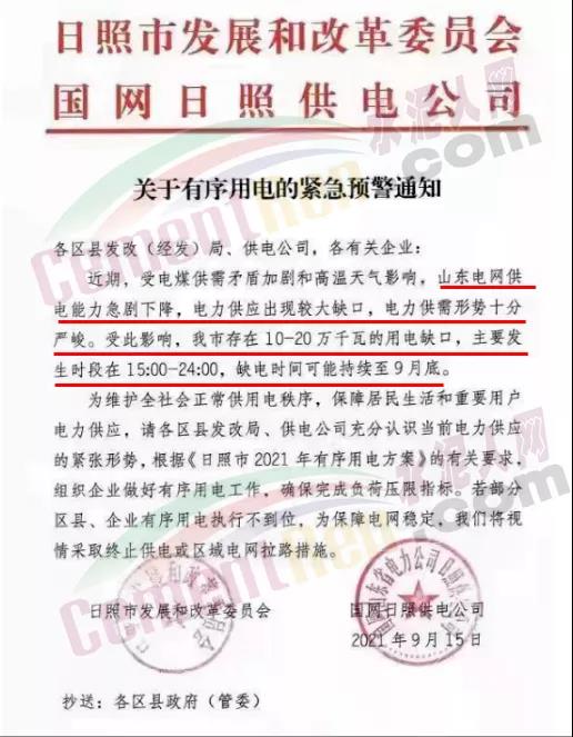 日照市发展和改革委员会国网日照供电公司发布《关于有序用电的紧急预警通知》称,近期,受电煤供需矛盾加剧和高温天气影响,山东电网供电能力急剧下降,电力供应出现较大缺口,电力供需形势十分严峻。受此影响,日照市存在10-20万千瓦的用电缺口,主要发生时段在15∶00-24∶00,缺电时间可能持续至9月底。