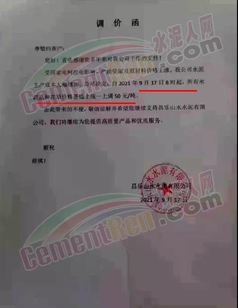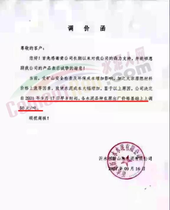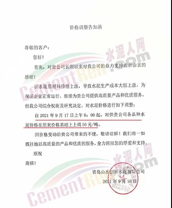 青岛山水创新水泥有限公司通知因水泥原材料价格上涨,导致水泥生产成本大幅上涨,为保证企业正常运行,经公司综合权衡及研究决定,自2021年9月17日上午8时起各品种水泥价格在原来价格基础上上调50元/吨。