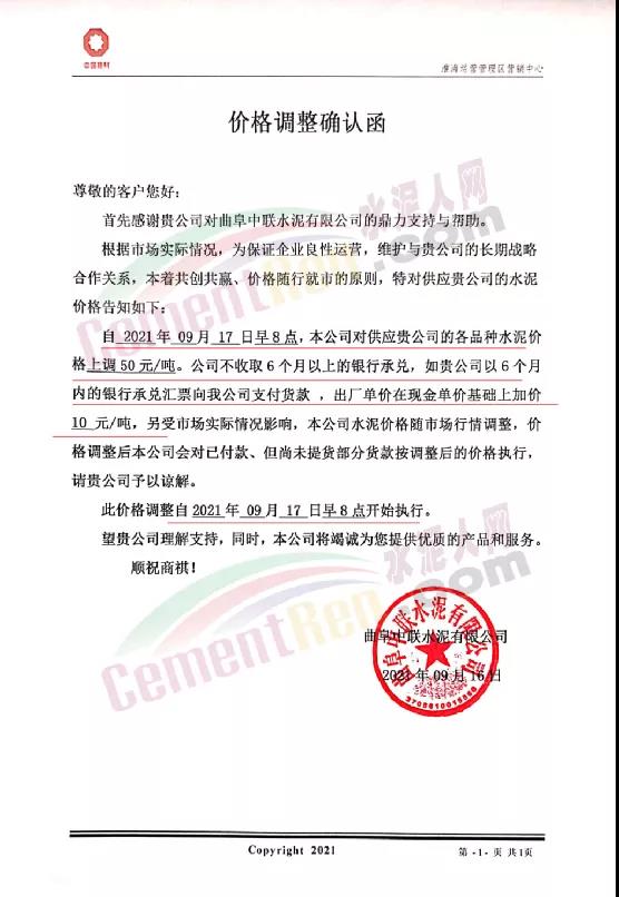 中联水泥淮海运营区曲阜中联水泥有限公司通知根据市场实际情况,为保证企业良性运营,自9月17日早8点各品种水泥价格上调50元/吨。公司不收取6个月以上的银行承兑,如贵公司以6个月内的银行承兑汇票向我公司支付货款,出厂单价在现金单价基础上加价10元/吨,另受市场实际情况影响,本公司水泥价格随市场行情调整,价格调整后本公司会对已付款、但尚未提货部分货款按调整后的价格执行。