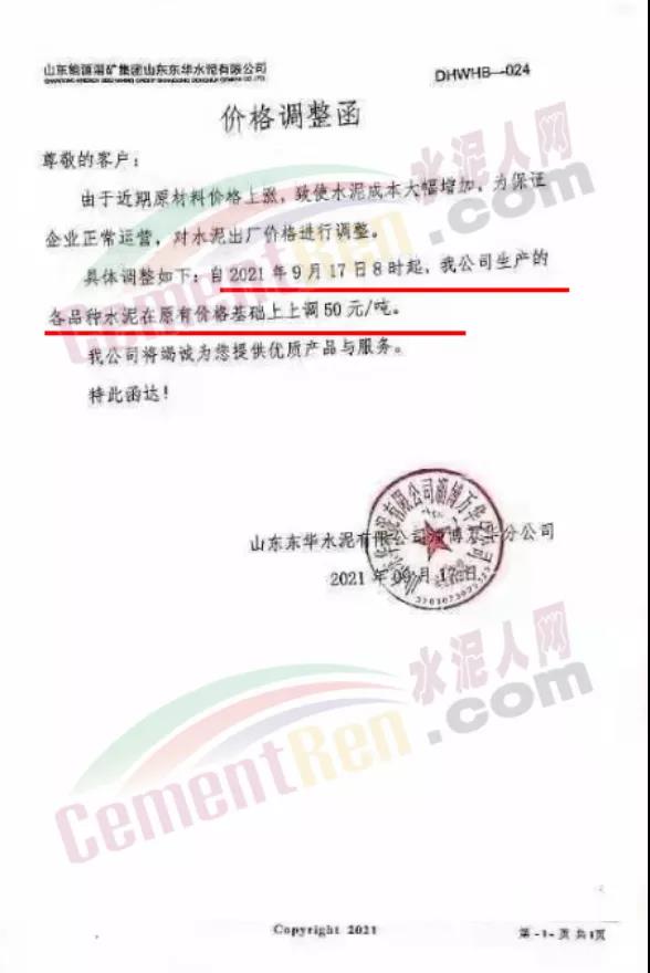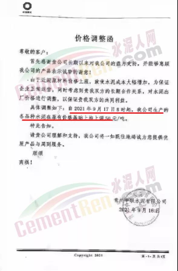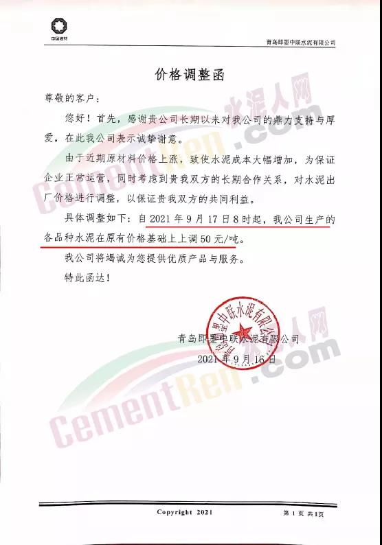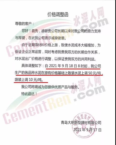 青岛即墨中联水泥有限公司通知,由于近期原材料价格上涨,致使水泥成本大幅增加,为保证企业正常运营,自2021年9月17日8时起,公司生产的各品种水泥在原有价格基础上上调50元/吨。