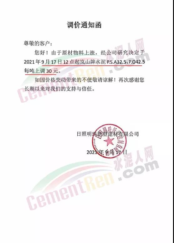 日照明珠新型建材有限公司通知,由于原材物料上涨,经公司研究决定于2021年9月17日12点起岚山牌水泥PS.A32.5、P.O42.5每吨上调30元。