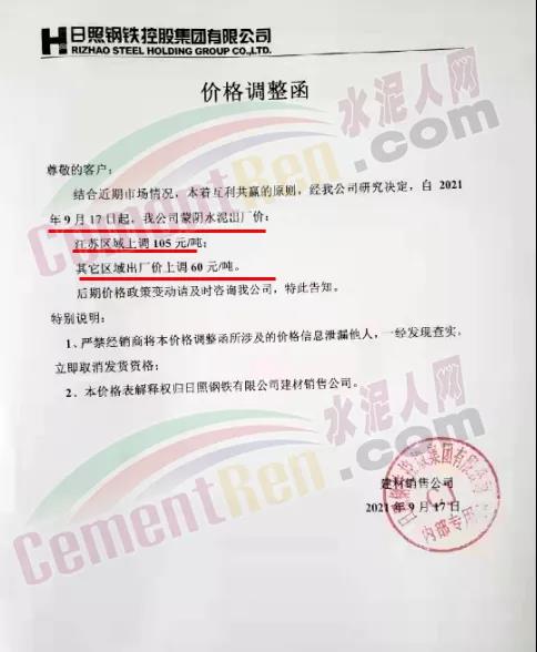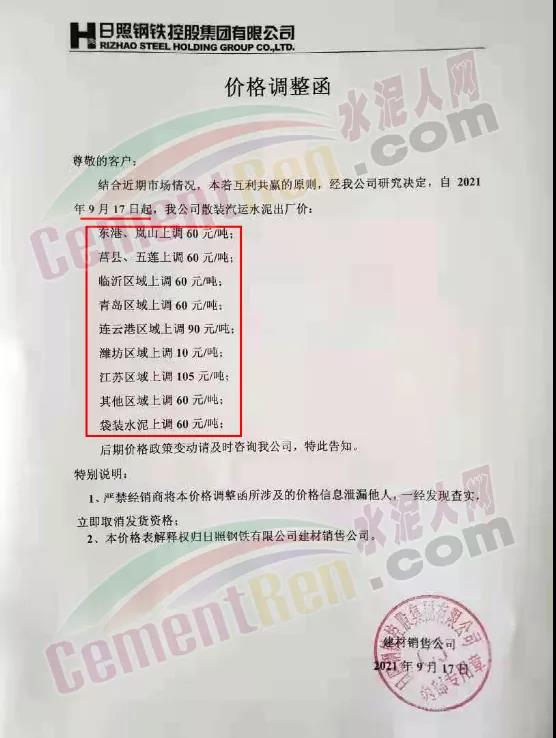 日照钢铁控股集团有限公司建材销售公司通知,结合近期市场情况,本着互利共赢的原则,经公司研究决定,自2021年9月17日起,公司散装汽运水泥出厂价东港、岚山上调60元/吨;莒县、五莲上调60元/吨∶临沂区域上调60元/吨;青岛区域上调60元/吨;连云港区域上调90元/吨∶潍坊区域上调10元/吨;江苏区域上调105元/吨∶其他区域上调60元/吨;袋装水泥上调60元/吨。