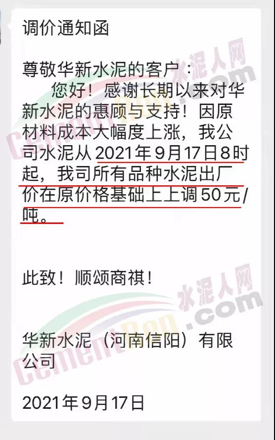 相关市场人士表示,山东涨价对河南区域也是个利好消息,华新水泥(河南信阳)有限公司通知因原材料成本大幅度上涨,公司水泥从2021年9月17日8时起,我司所有品种水泥出厂价在原价格基础上上调50元/吨。