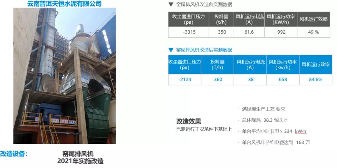 该项目于2021年实施改造,生料磨循环风机改造后同比运行功率下降937kW。