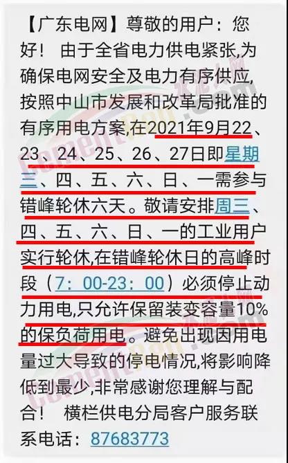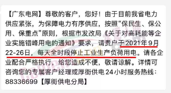 9月22日,东莞某企业收到广东电网东莞供电局厚街供电分局的一则短信通知,“由于目前我省电力供应紧张,为保障电力有序供应,按照‘保民生、保公用、保重点’原则,根据市发改局《关于对高耗能等企业实施错峰用电的通知》要求,请贵户于2021年9月22-26日,每天全时段停止工业生产负荷用电。”