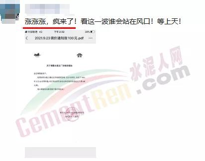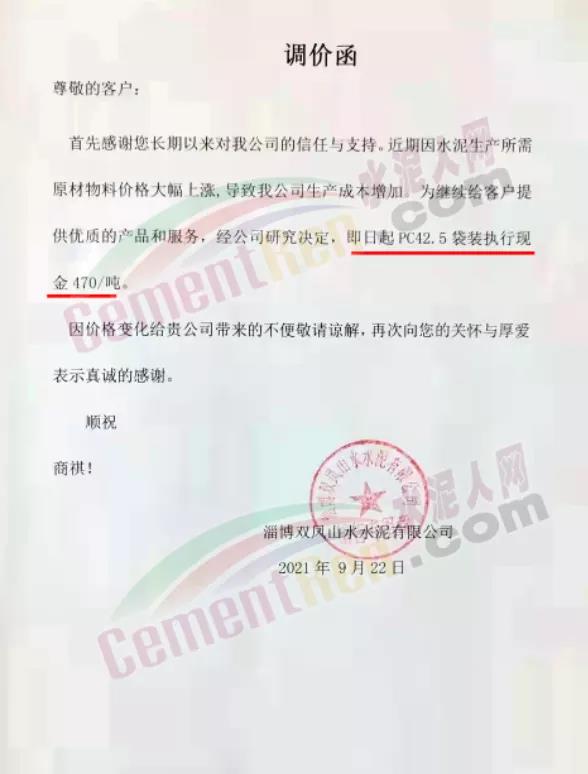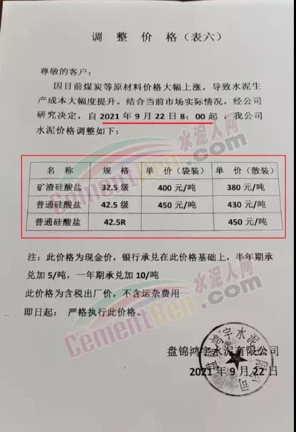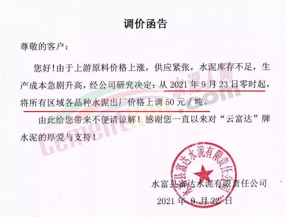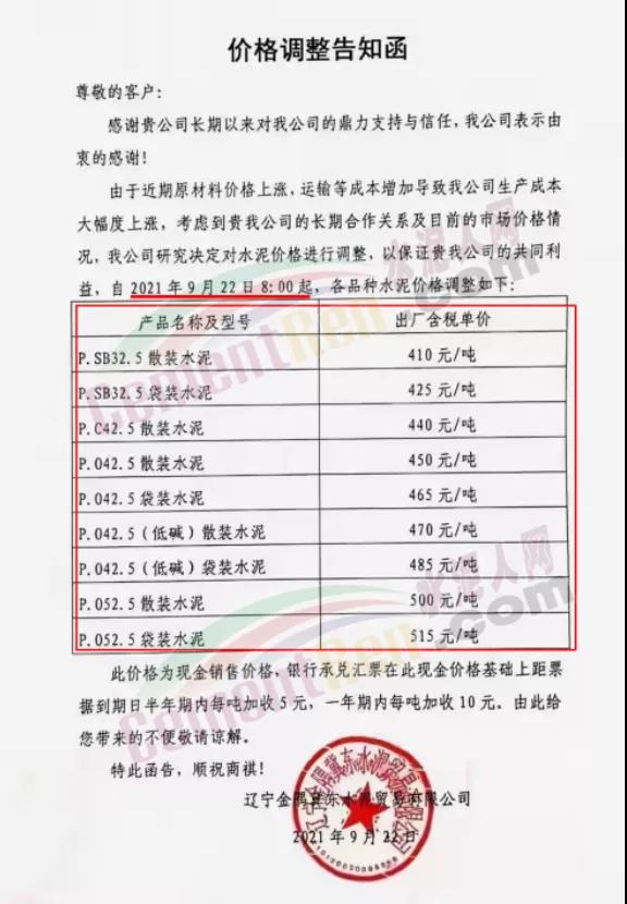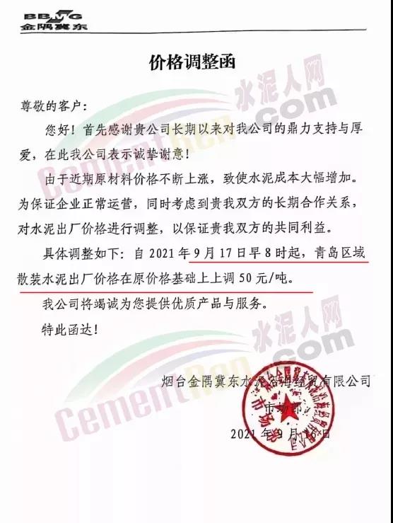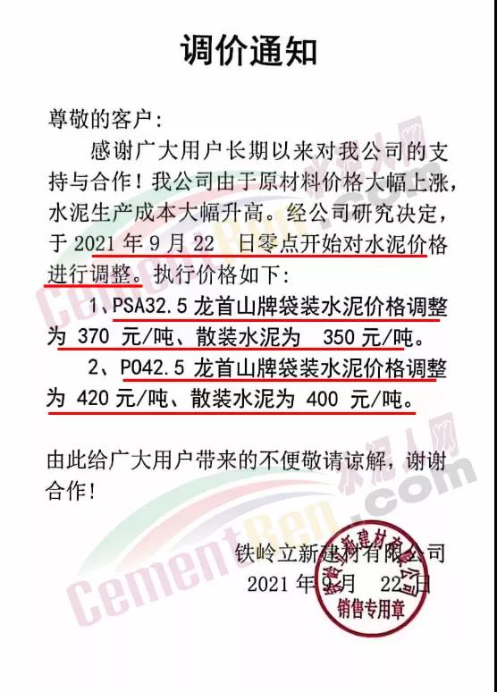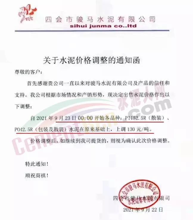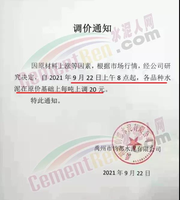 禹州市钧都水泥有限公司通知因原材料上涨等因素,根据市场行情,经公司研究决定,自2021年9月22日上午8点起,各品种水泥在原价基础上每吨上调20元。