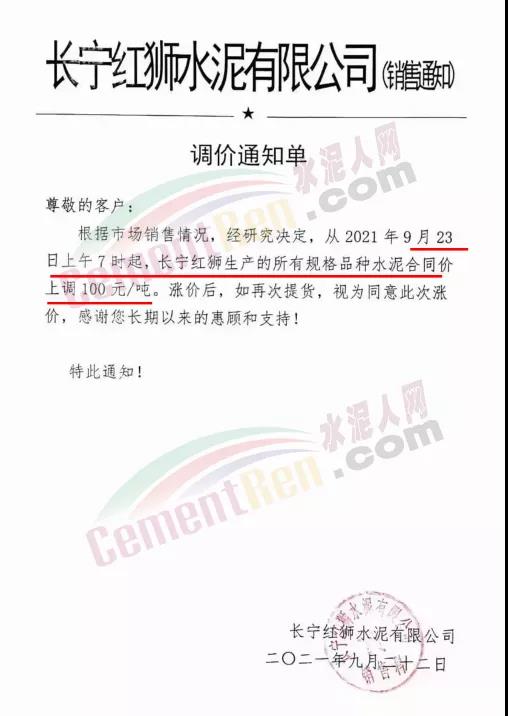 长宁红狮水泥通知自9月23日上午7时起,所有品种水泥合同价上调100元/吨。