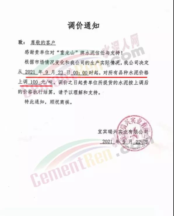 宜宾瑞兴实业有限公司通知,9月23日0时起,所有品种水泥价格上调100元/吨。