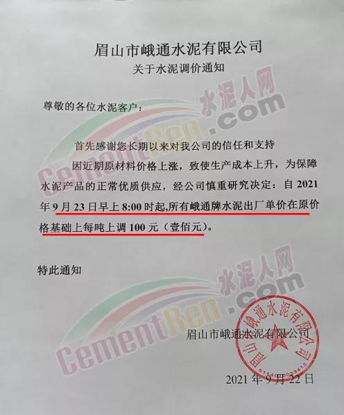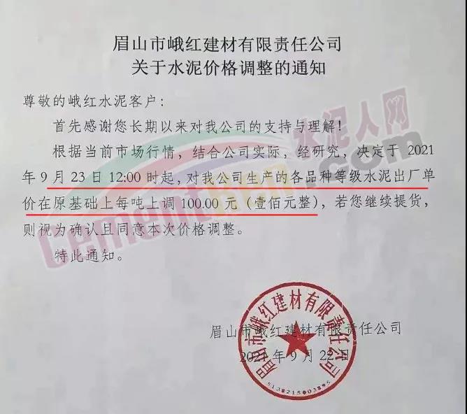 眉山市峨红建材有限责任公司通知根据当前市场行情,结合公司实际,经研究,决定于2021 年9月23日12时起,对公司生产的各品种等级水泥出厂单价在原基础上每吨上调100元/吨。