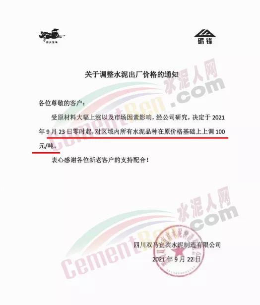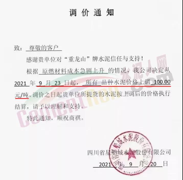 四川省星船城水泥股份有限公司通知根据原燃材料成本急剧上升的情况,公司决定从2021年9月23日起,所有品种水泥价格上调100元/吨。