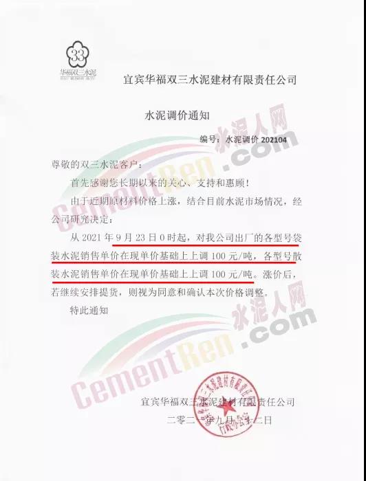 宜宾华福双三水泥建材有限公司通知9月23日0时起,水泥价格上调100元/吨。