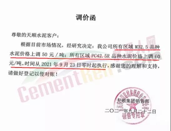 宜宾市天顺建材集团股份有限公司通知从2021年9月23日零时起所有区域M32.5品种水泥价格上调50元/吨;所有区域PC42.5R品种水泥价格上调60元/吨。