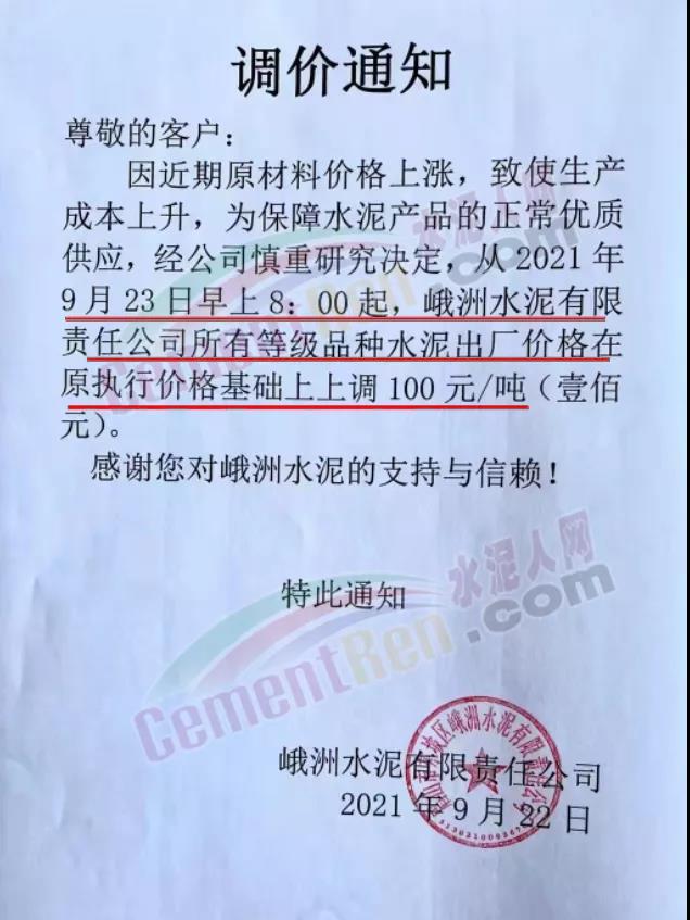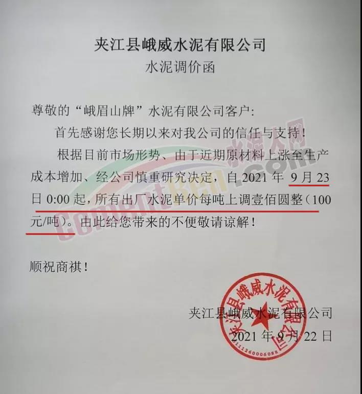 四川省乐山市夹江县峨威水泥有限公司通知根据目前市场形势、由于近期原材料上涨至生产成本增加、经公司慎重研究决定,自2021年9月23日0时起,所有出厂水泥单价每吨上调100元/吨。