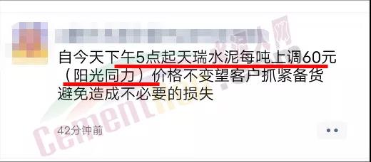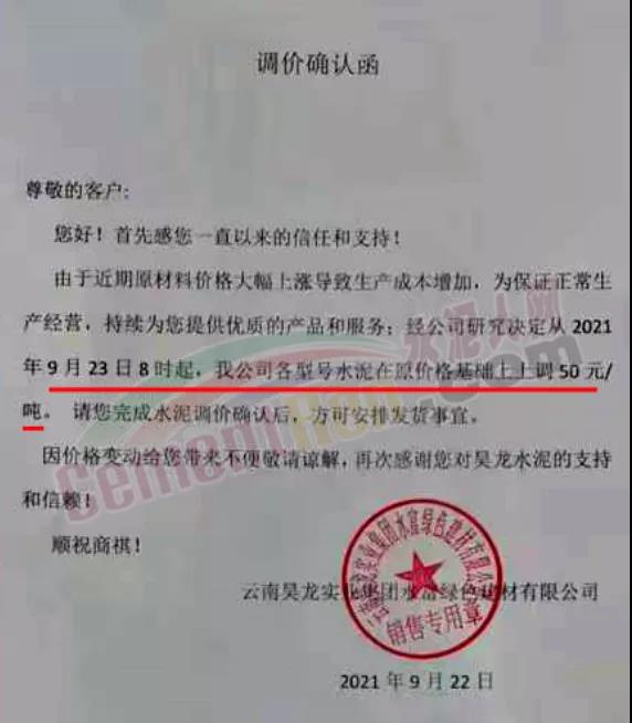 云南昊龙实业集团水富绿色建材有限公司通知,由于近期愿材料价格大幅上涨导致生产成本增加,为保证正常生产经营,经公司研究决定从2021年9月23日8时起,各型号水泥在原价格基础上上调50元/吨。