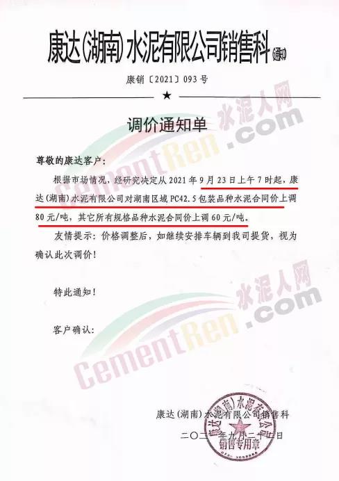 康达(湖南)水泥有限公司销售科通知,根据市场情况,经研究决定从2021年9月23日上午7时起,康达(湖南)水泥有限公司对湖南区域PC42.5包装品种水泥合同价上调80元/吨,其它所有规格品种水泥合同价上调60元/吨。