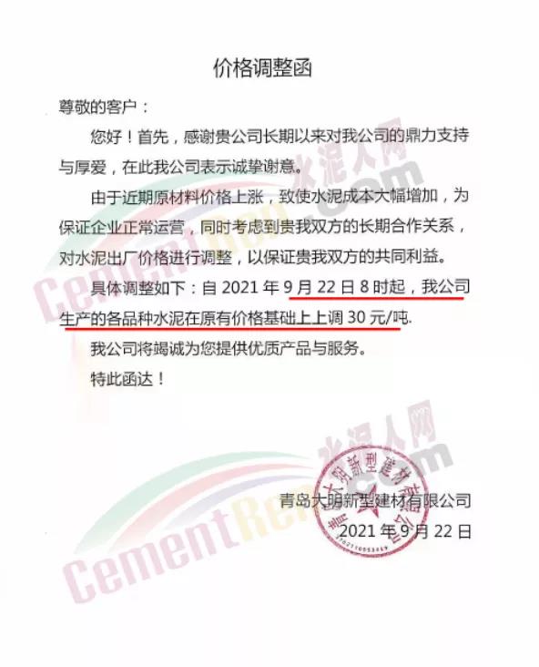 青岛大明新型建材有限公司通知由于近期原材料价格上涨,致使水泥成本大幅增加,为保证企业正常运营,自2021年9月22日8时起,公司生产的各品种水泥在原有价格基础上上调30元/吨。
