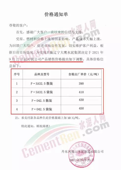 丹东凤凰山水泥通知,自9月22日起调整水泥价格,P.O42.5散装水泥调整为430元/吨,承兑付款在此价格基础上加10元/吨。