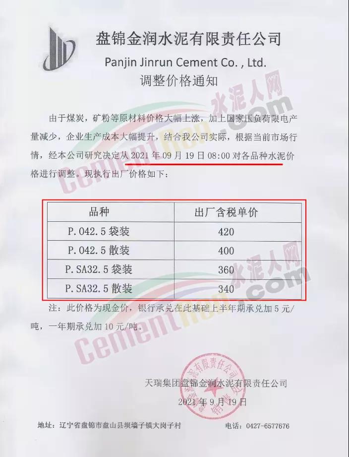 盘锦金润水泥通知,9月19日起调整水泥价格,PO42.5散装水泥报价400元/吨。
