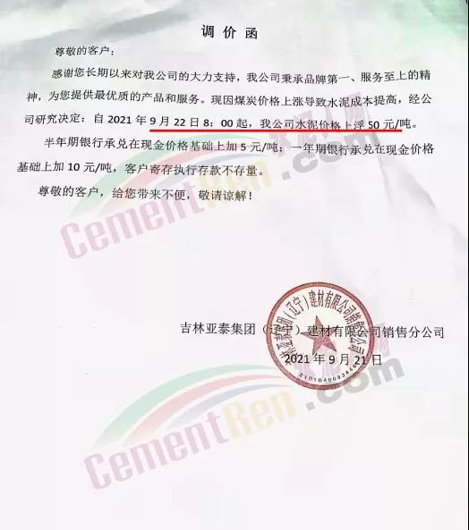 吉林亚泰企业辽宁公司通知,9月22日起,公司水泥价格上浮50元/吨。