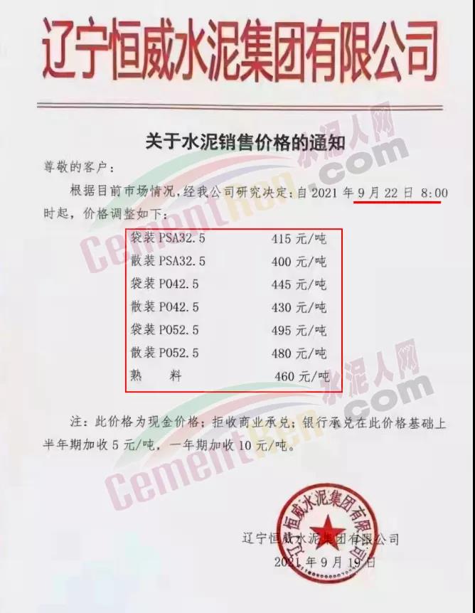 辽宁恒威水泥通知,9月22日8时起上调各标号水泥价格,P.O42.5散装水泥报价430元/吨。