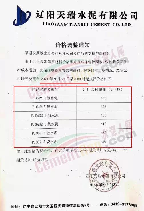 辽阳天瑞水泥通知,自9月22日早8时起上调各标号水泥价格,PO42.5散装水泥执行430元/吨。