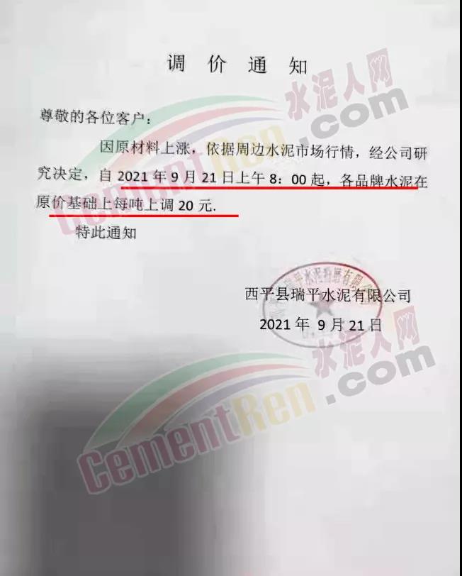 河南省驻马店市平县瑞平水泥有限公司通知因原材料上涨,依据周边水泥市场行情,经公司研究决定,自2021年9月21日上午8时起,各品牌水泥在原价基础上上调20元/吨。