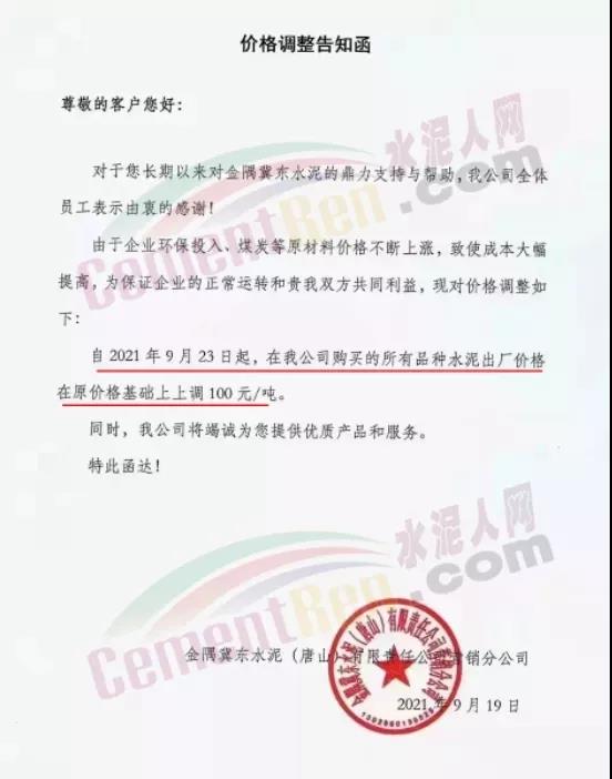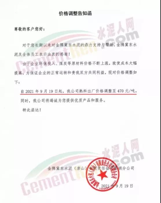 金隅冀东水泥(唐山)有限责任公司自2021年9月23日起所有品种水泥出厂价格在原价格基础上上调100元/吨;熟料出厂价调整至470元/吨。