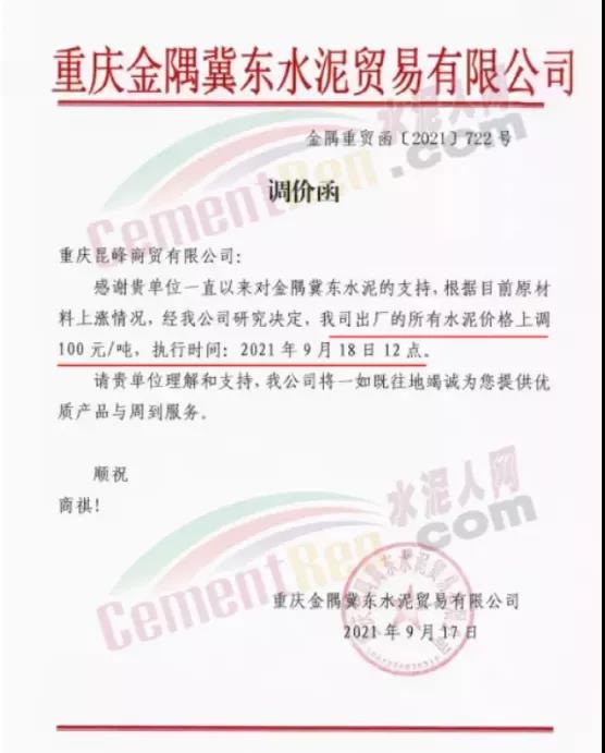 重庆金隅冀东水泥贸易有限公司通知,自2021年9月18日12点所有水泥价格上调100元/吨。