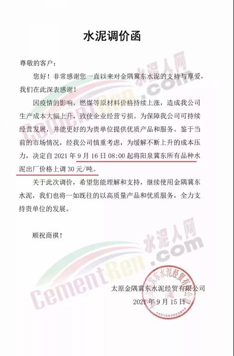 山西太原金隅冀东水泥经贸有限公司通知,因疫情的影响,燃煤等原材料价格持续上涨,造成公司生产成本大幅上升,致使企业经营亏损。为保障公司可持续经营发展,并能更好的为贵单位提供优质产品和服务。鉴于当前的市场情况,经公司慎重考虑,为缓解不断上升的成本压力,决定自2021年9月16日08∶00起将阳泉冀东所有品种水泥出厂价格上调30元/吨。