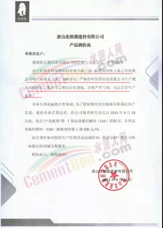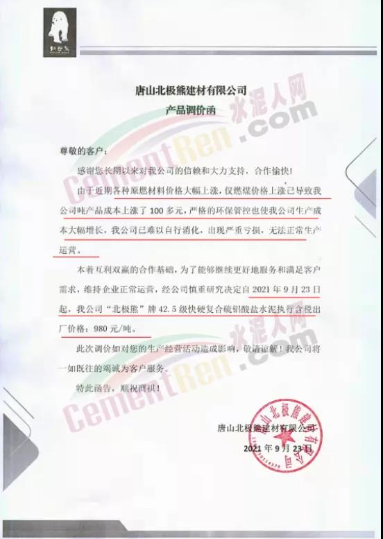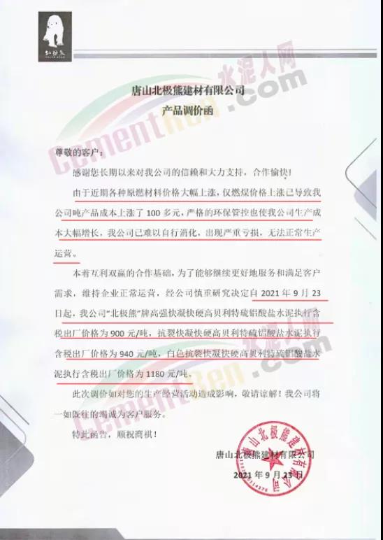 特种水泥方面,不仅山东区域,河北区域也有多家特种水泥企业上调水泥价格。唐山北极熊建材有限公司连发三份产品调价函称,由于近期各种原燃材料价格大幅上涨,仅燃煤价格上涨已导致公司吨产品成本上涨了100多元,为了能够维续更好地服务和满足客户需求,维持企业正常运营。