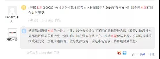 该消息一出,多位投资者在市公司平台向海螺水泥提出相关区域的限电政策是否影响到了企业正常的生产,公司生产用煤炭是否存在供应缺口等问题。