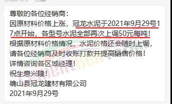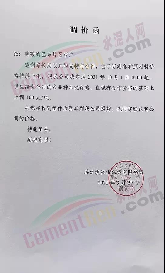 葛洲坝兴山水泥有限公司通知,由于近期各种原材料价格持续上涨,现公司决定从2021年10月1日0∶00起,供应给贵公司的各品种水泥价格,在现有合作价格的基础上上调100元/吨。