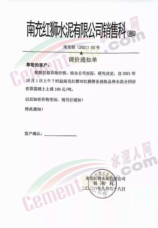 南充红狮水泥通知,10月1日上午7时起上调各标号水泥价格100元/吨。