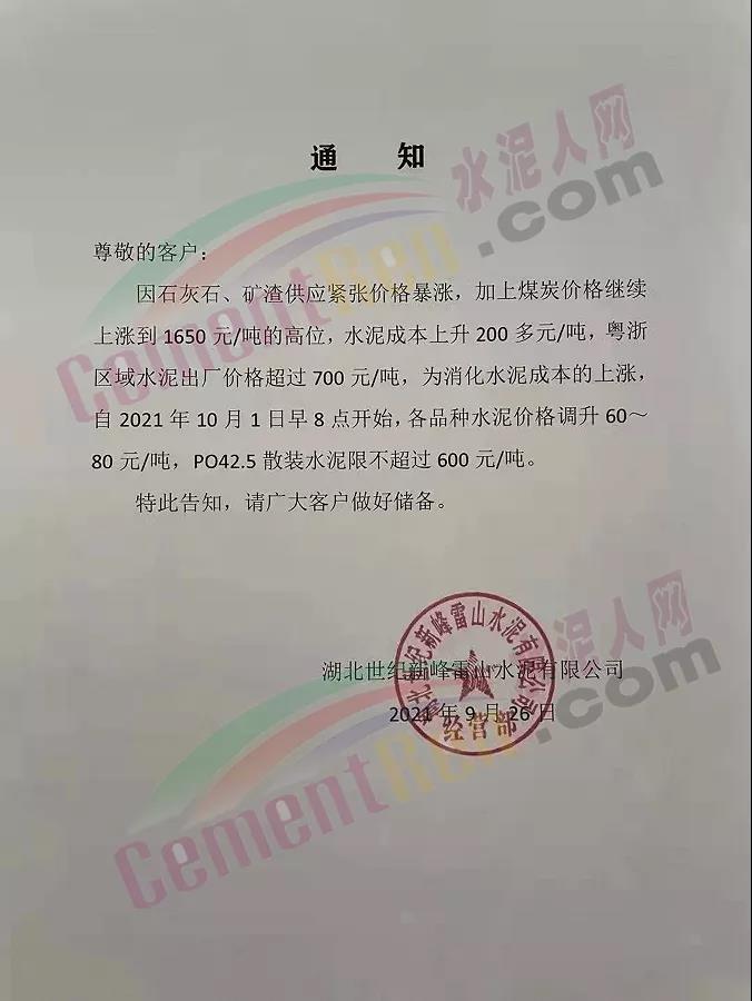 湖北世纪新峰雷山水泥有限公司通知,因石灰石、矿渣供应紧张价格暴涨,加上煤炭价格继续上涨到1650元/吨的高位,水泥成本上升200多元/吨,粤浙区域水泥出厂价格超过700元/吨,为消化水泥成本的上涨,自2021年10月1日早8点开始,各品种水泥价格调升60~80元/吨,PO42.5散装水泥限不超过600元/吨。
