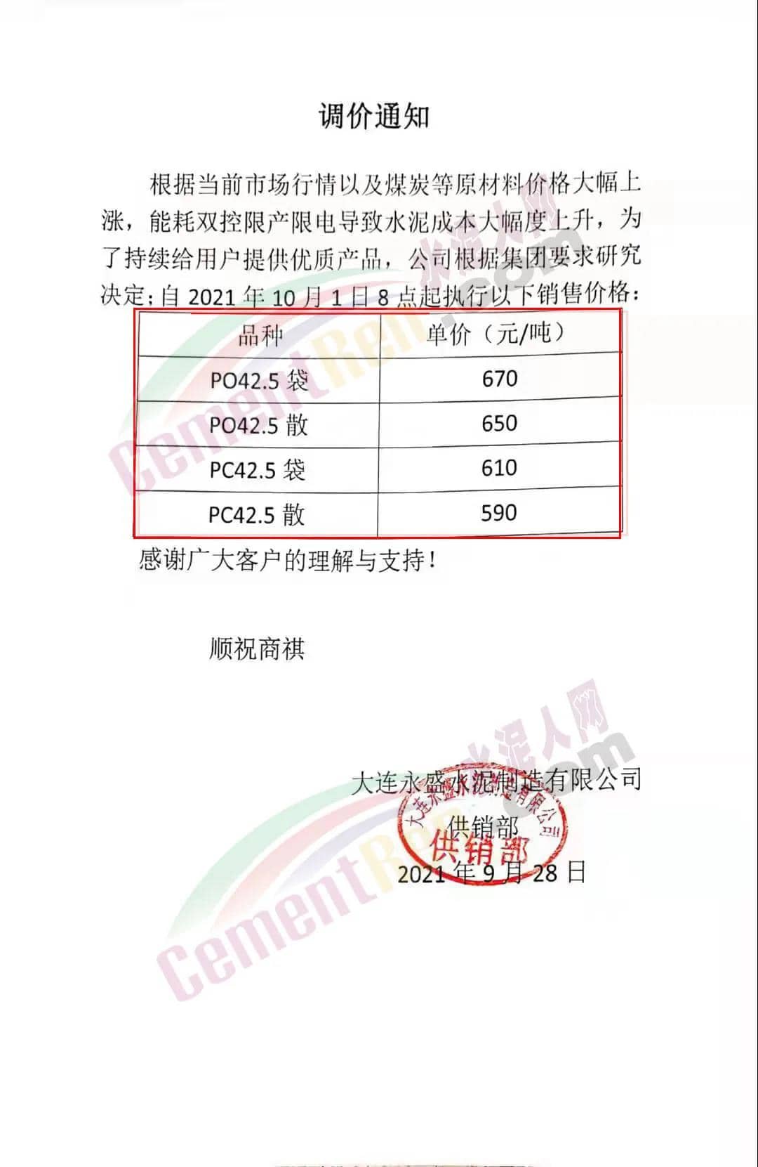 大连水泥集团,通知由于当前的煤炭等原燃材料持续上涨,近期又受到全国性限电的影响 ,工厂实行间歇性组织生产,导致水泥生产成本大幅增加,目前限电状况不能正常保供,公司以成本价保证重点用户的水泥供货,因此自9月30日8时起各品种水泥执行最新出厂价,其中P.O42.5R散装水泥报价670元/吨,P.C42.5包装水泥报价630元/吨。