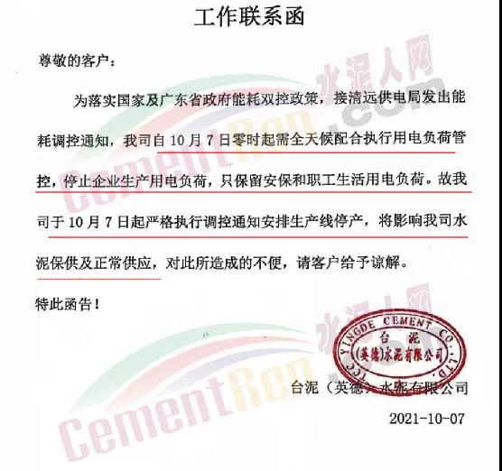 广东鸿丰水泥有限公司通知为贯彻落实党中央、国务院关于强化能耗双控的决策布置,加强能耗双控。韶关电网发出能耗调控通知,自10月1日零时起全停电。我公司10月2日起执行通知,两条窑全停、水泥磨机全停产,只能维持基本的生活用电,因此将影响水泥的发运。