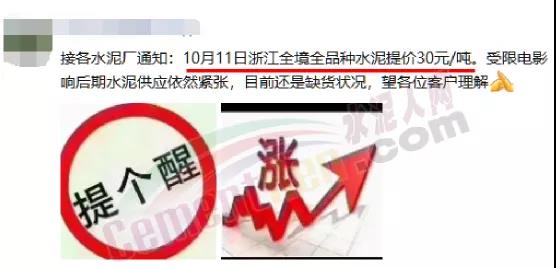 日前,浙江区域经销商发消息称,接各水泥厂通知10月11日浙江全境全品种水泥提价30元/吨。受限电影响水泥供应依然紧张,目前还是缺货状况。