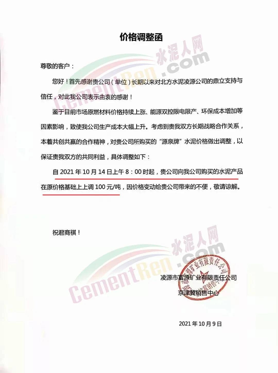辽宁朝阳凌源市富源矿业有限责任公司京津冀销售中心通知鉴于目前市场原燃材料价格持续上涨、能源双控限电限产、环保成本增加等因素影响,致使公司生产成本大幅上升。自2021年10月14日上午8时起公司"源泉牌"水泥价格在原价格基础上上调100元/吨。