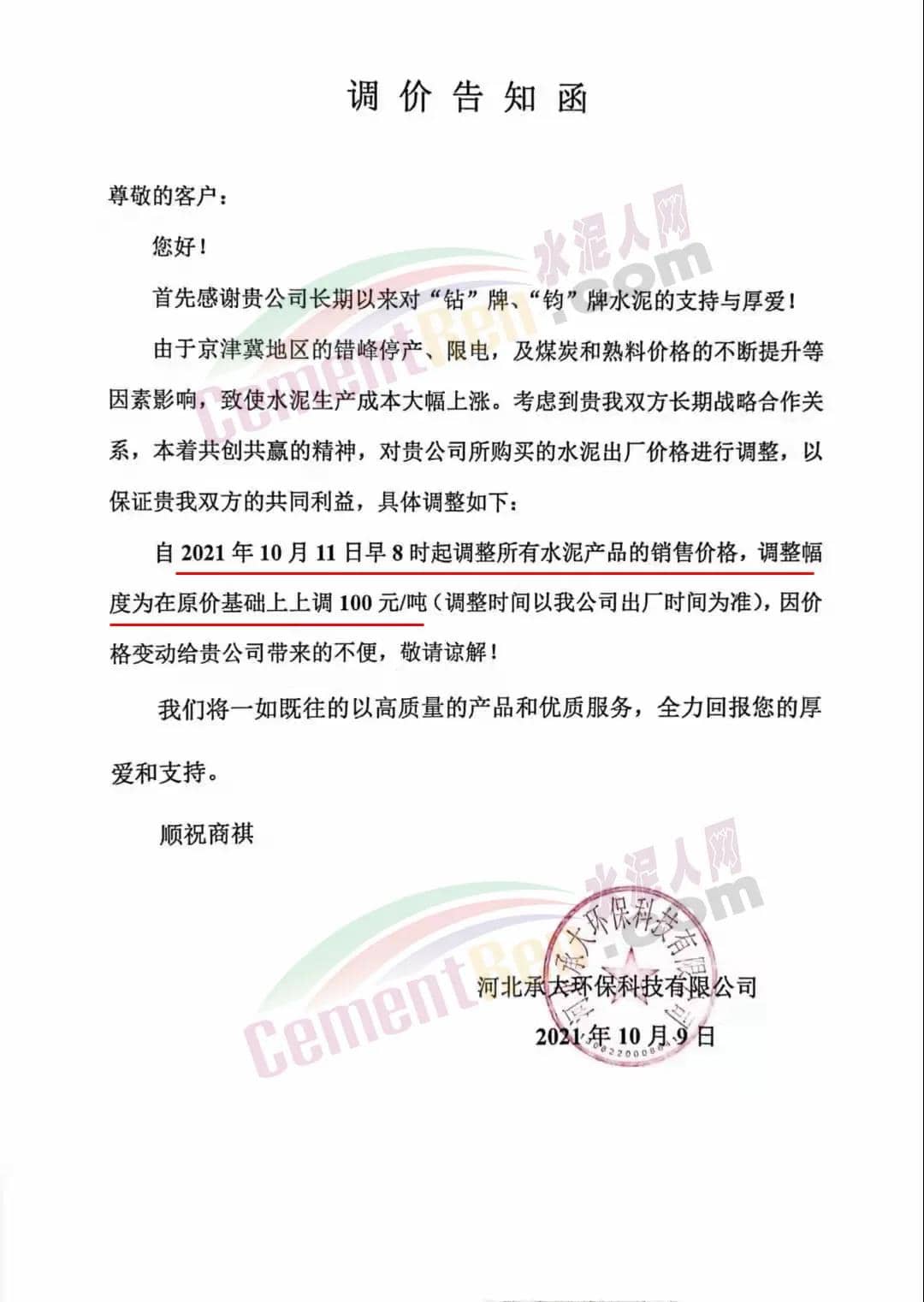 河北承大环保科技有限公司通知,由于京津冀地区的错峰停产、限电,及煤炭和熟料价格的不断提升等因素影响,致使水泥生产成本大幅上涨,自2021年10月11日早8时起所有水泥产品销售价格在原价基础上上调100元/吨。