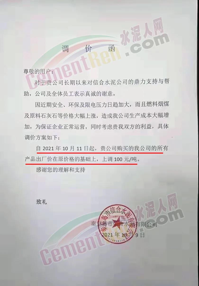 秦皇岛信合水泥有限公司通知,因近期安全、环保及限电压力日趋加大,而且燃料烟煤及原料石灰石等价格大幅上涨,造成公司生产成本大幅增加,为保证企业正常运营,自2021年10月11日起,公司的所有产品出厂价在原价格的基础上,上调100元/吨。