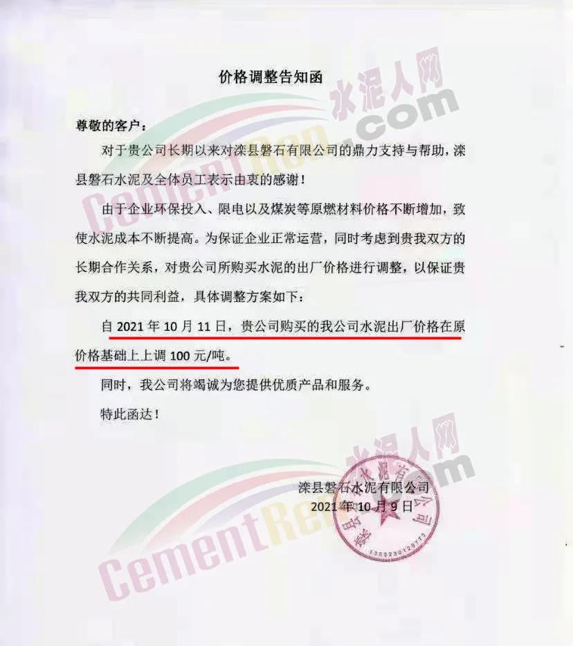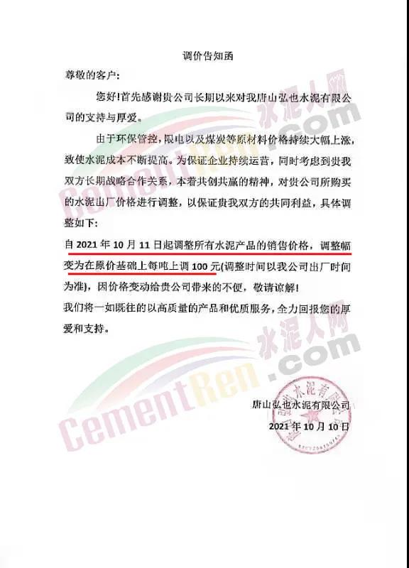 唐山弘也水泥有限公司通知,由于环保管控,限电以及煤炭等原材料价格持续大幅上涨,致使水泥成本不断提高。为保证企业持续运营,自2021年10月11日起调整所有水泥产品的销售价格在原价基础上上调100元/吨。