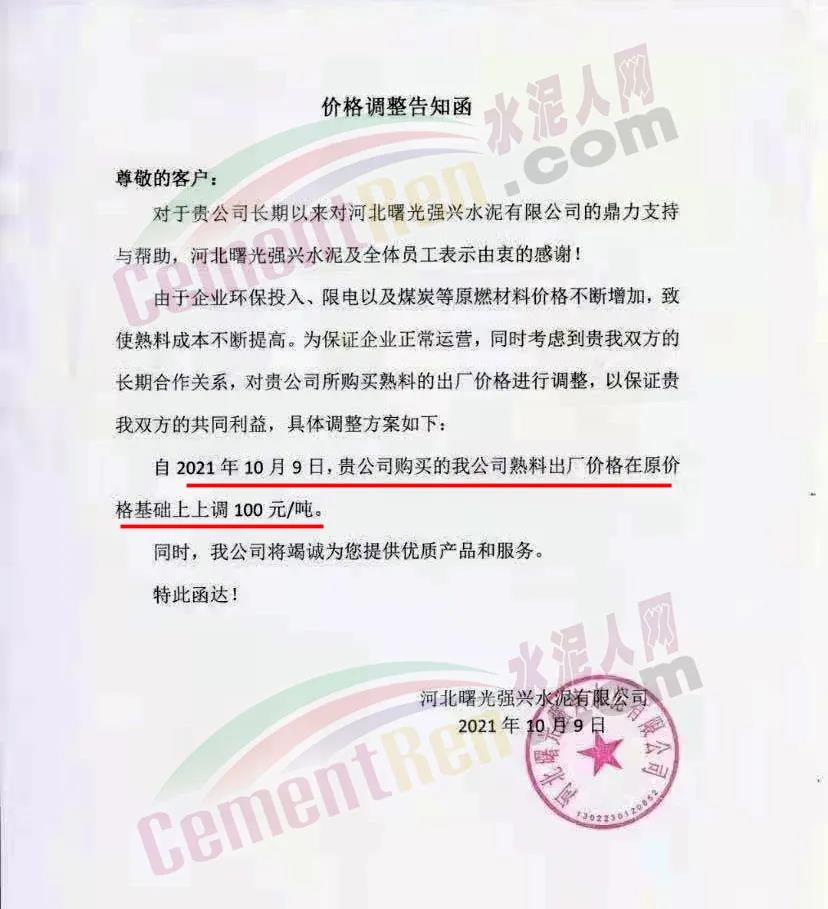 河北曙光强兴水泥有限公司通知,由于企业环保投入、限电以及煤炭等原燃材料价格不断增加,致使熟料成本不断提高。为保证企业正常运营,自2021年10月9日,公司熟料出厂价格在原价格基础上上调100元/吨。