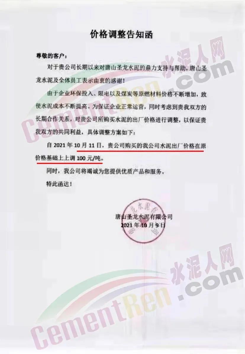唐山圣龙水泥有限公司通知由于企业环保投入、限电以及煤炭等原燃材料价格不断增加,致使水泥成本不断提高。为保证企业正常运营,自2021年10月11日,公司水泥出厂价格在原价格基础上上调100元/吨。
