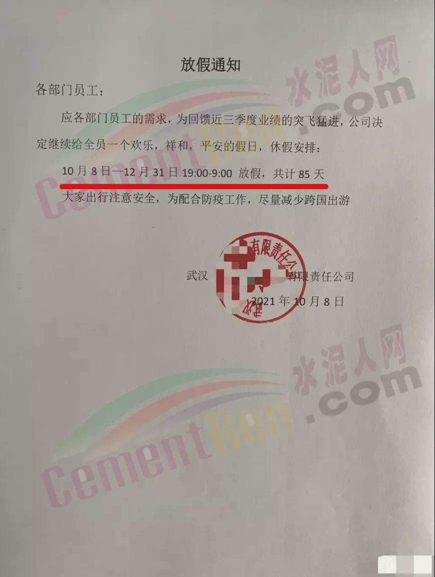 近日,湖北武汉某企业发布放假通知,称应各部门员工的需求,为回馈近三季度业绩的突飞猛进,决定继续给全员一个欢乐,祥和,平安的假日,休假安排:10月8日一12月31日19:00-9:00放假,共计85天。