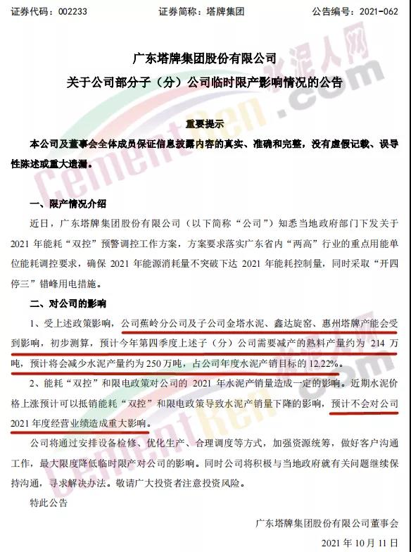 10月11日塔牌集团称,近日,广东塔牌集团股份有限公司知悉当地政府部门下发关于2021 年能耗“双控”预警调控工作方案,方案要求落实广东省内“两高”行业的重点用能单位能耗调控要求,确保2021年能源消耗量不突破下达2021年能耗控制量,同时采取“开四停三”错峰用电措施。