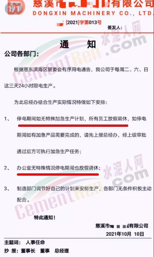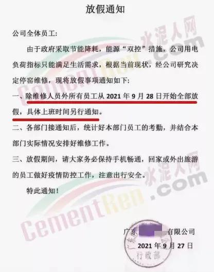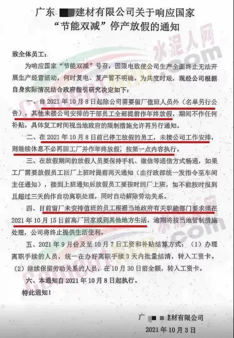 同日,辽宁省辽阳市工信局发布通知要求自2021年10月9日8时起,对水泥行业8户熟料企业、11条熟料生产实施有序用电措施,期间水泥熟料生产停止用电,有序用电时间预计不低于15天,结束时间另行通知。同时要求对擅自启动水泥熟料生产用电的企业,要责令改正,情节严重的停止供电。