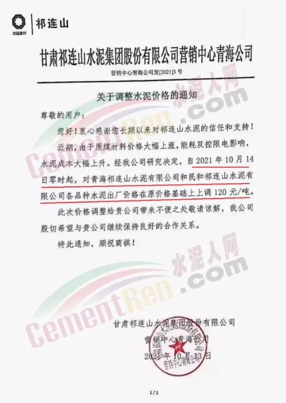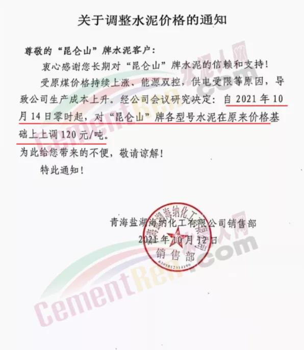 青海盐湖海纳化工有限公司销售部通知,受原煤价格持续上涨、能源双控,供电受限等原因,导致公司生产成本上升。经公司会议研究决定∶自2021年10月14日零时起,对“昆仑山”牌各型号水泥在原来价格基础上上调120元/吨。