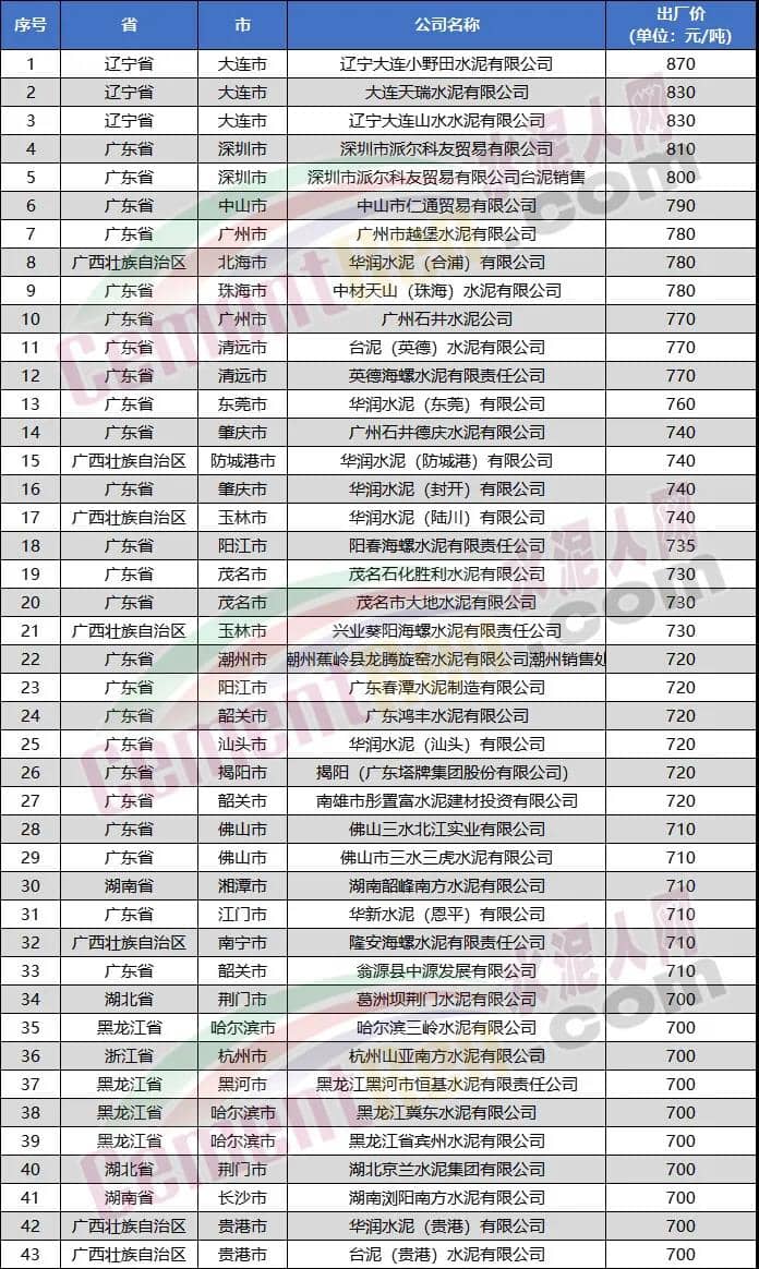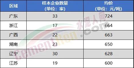 据水泥人网信息中心重点监管的600多家企业数据显示,目前,出厂均价在600-900元/吨的区域有辽宁省、广东省、广西壮族自治区、湖南省、江苏省、浙江省以及四川和重庆等区域,广东区域个别企业市场到位价超1000元/吨。