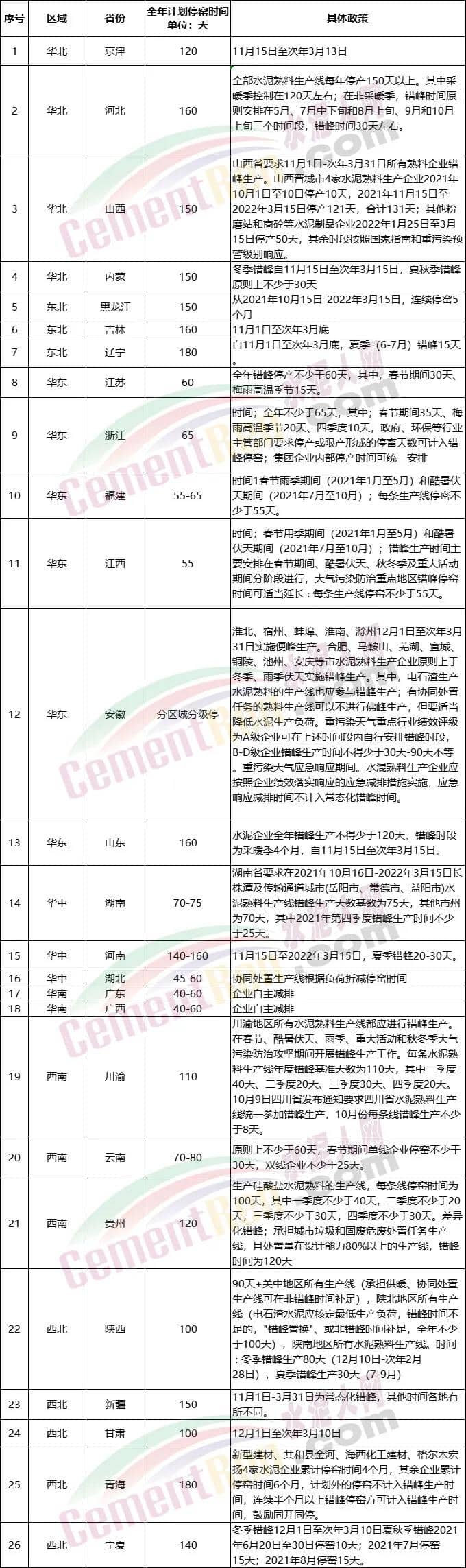 山西晋城市对重点行业煤化工行业、钢铁行业、水泥、焦化等行业企业在2021年10月1日-2022年3月31日采取区域统筹的方式,实行轮流停产减排和差异化管控。对于4家水泥熟料生产企业要求,2021年10月1日至10日停产10天,2021年11月15日至2022年3月15日停产121天,合计131天;其他粉磨站和商砼等水泥制品企业2022年1月25日至3月15日停产50天,其余时段按照国家指南和重污染预警级别响应。