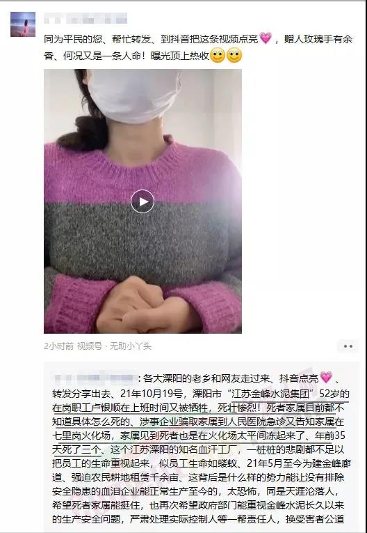 日前,网友“无助小丫头”发布消息称“2021年10月19号,溧阳市“江苏金峰水泥集团”52岁的在岗职工卢银顺在上班时间又被牺牲,死壮(状)惨烈!死者家属目前都不知道具体怎么死的、涉事企业骗取家属到人民医院急诊又告知家属在七里岗火化场,家属见到死者也是在火化场太平间冻起来了、年前35天死了三个。21年5月至今为建金峰廊道、强迫农民耕地租赁千余亩,这背后是什么样的势力能让没有排除安全隐患的血泪企业能正常生产至今的,同是天涯沦落人,希望死者家属能挺住,也再次希望政府部门能重视金峰水泥长久以来的生产安全问题,严肃处理实际控制人等一帮责任人,换(还)受害者公道。”